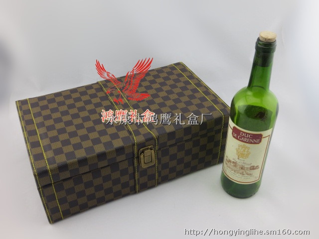 金华精美双支装格子款红酒包装礼品盒,皮质酒盒厂家