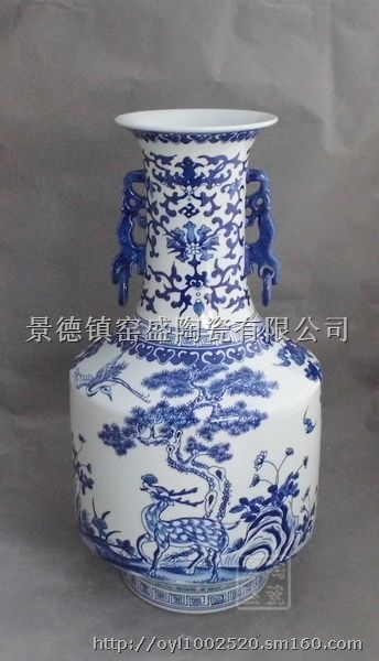 此款高仿青花双耳尊高51公分,肚径25公分,为全手工手绘而成,青花色淡雅而清新,底部绘以一圈回纹图案,瓶身是圆柱形突出,梅花鹿口衔灵芝,昂首阔步,仙鹤准备停在松树上休息,寓意着吉祥如意,健康长寿;另在在配上小山,花草等,瓶颈用缠枝纹绘制,瓶颈上两边各雕刻一只老虎,口含圆圈,形态威武,能够驱散邪恶,整个瓶子在颜色和比列的搭配非常恰当,美工精细,器型优美,是一件非常好的收藏品,非常适合送礼和摆设。