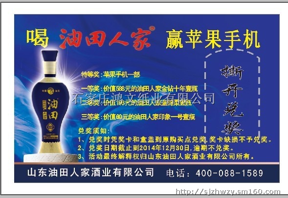 奖卡体正面图案由企业产品和企业LOGO组成,并在正面的位置做去一个“刮开区”,此区内可设置不同比列的奖项或中奖信息在内。刮开区通过丝网涂上一层银层(印刷术语叫刮刮银),卡体背面印有:商家的活动说明或奖项说明等等内容。银层把刮开区内的内容完全盖住,这样在商家活动时,消费者现场刮开时才能知道里面的内容,起到保密的作用。
