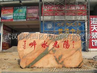 湖北阳光水岸园林景观石位于湖北黄石市,该石头为一块晚霞红玉石,颜色黄色,长4米,高2.3米,厚0.8米,外形美观自然,表面平整,可做门牌景观石之用。