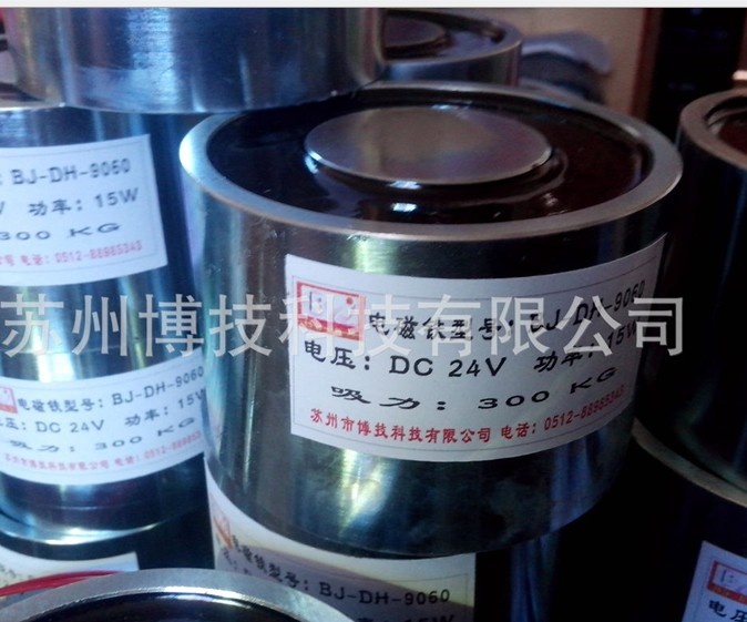专业生产各式电磁吸铁(电磁吸盘) 吸力从3N-5000N(0.3KG-5000KG),具体请联系BJ-DH-9060 外径90mm 高度60mm DC24V 15W吸力400KG(4000N),可长时间通电。