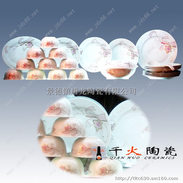 景德镇陶瓷厂生产餐具,陶瓷餐具,批发餐具,套装陶瓷餐具,高档礼品陶瓷餐具。公司著名品牌——千火陶瓷主营公司最新产品。餐具画面众多,精品餐具适合商务礼品的馈赠,公司福利礼品的发放。景德镇餐具主要有釉中骨质瓷餐具、釉上骨质瓷餐具、青花瓷餐具、青花玲珑餐具(又称“米通”餐具)、玉瓷餐具(又称“高白瓷”餐具,更有多种类的零散餐具。餐具主要以套装为主。其中56头餐具和38头餐具居多。餐具套装说明: