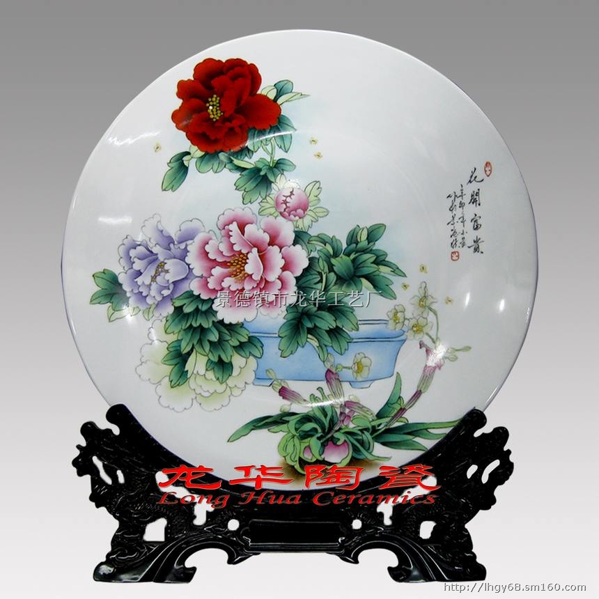 景德镇龙华工艺厂专业生产手绘陶瓷赏盘,家居摆设装饰品盘子。瓷盘的规格有15cm-40cm不等。瓷质有白瓷、高白瓷、骨质瓷等不同质量的瓷质。可以根据客户的要求定做不同规格、不同瓷质、不同画面的礼品瓷盘。一块瓷盘配置一个高档瓷器锦盒包装和一个盘架就是一套精美的陶瓷礼品了,适合于各种大型纪念活动礼品、家居装饰品、校庆活动礼品、庆典活动礼品。本厂生产的手绘新彩陶瓷赏盘,色彩丰富,款式众多。图案新颖,寓意非凡。适合各种商务礼品的赠送。可以接受小批量定单。我们自己生产,时间易把握,可以承诺在保证质量的前提下做到最短时间内交货。