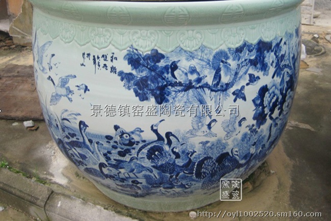 本厂制作的和谐盛世直径1.8米,檐口和缸底喷以豆青釉,缸身用青花釉料绘以百鸟齐名象,巧妙的运用颜色的差异突出的中间绘画的图景,就图中鸟的种类不说,但看各个鸟的神态形态,有展翅安详、昂头挺胸的等等,表现了生气勃勃的大自然景象,有着祥和盛世,国泰民安的祝福,是一件送礼和摆件的佳品。