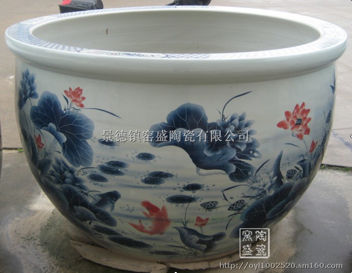 釉里连年有余大缸直径1.5米和1.8米,外形大气秀美,釉里红精妙的点出莲花和红鲤鱼,青花有深有浅,充分利用国画的形式表现出莲花鲤鱼的立体感,轮廓分明。而莲意为年,鱼为余。表示连年有余。即丰庆有余,生活的富裕。指丰衣足食。一件很有意义价值的“大”艺术品,摆设在酒店、公司、园林景点等地都是十分吉祥和吸引眼球的。