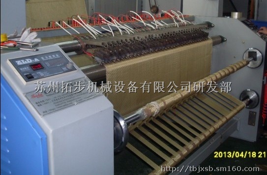 热切机用途与特点:苏州拓步机械设备有限公司生产的热分切机(热切捆条机、热切机、斜纹热切机、电热分条机、热分切机、热分条机、电热分切机)操作简单,是多刀型排刀分切,分切宽度可根据需要在最小分切宽度的基础上任意调节。生产速度任意调节,机械操作平稳灵活。热分切机主要采用电子恒温控制系统控制切刀加热,没有任何热导中介,极大的减少了能量损失,从而提高节能效果,切边光滑整洁,不留布焦。自动进料与收料一次性完成,边料自动收卷。热分切机采用独立的光电自动对边系统,使分切过程平滑顺畅,布料更整齐,大幅减少边料的损耗。     热分切机所用的热切刀采用钨钢合金经过特殊工艺加工制成,使用寿命得到大幅度提高。在分切的同时,利用温度将布料的毛边封住。使布料没有毛边产生。并不留布焦。
