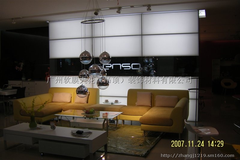 软膜:采用特殊的聚氯乙烯材料制成,0.18毫米厚,其防火级别为B1级。软膜通过一次或多次切割成形,并用高频焊接完成。软膜需要在实地测量出天花尺寸后,在工厂里制作完成。软膜尺寸的稳定性在摄氏-15度到45度。