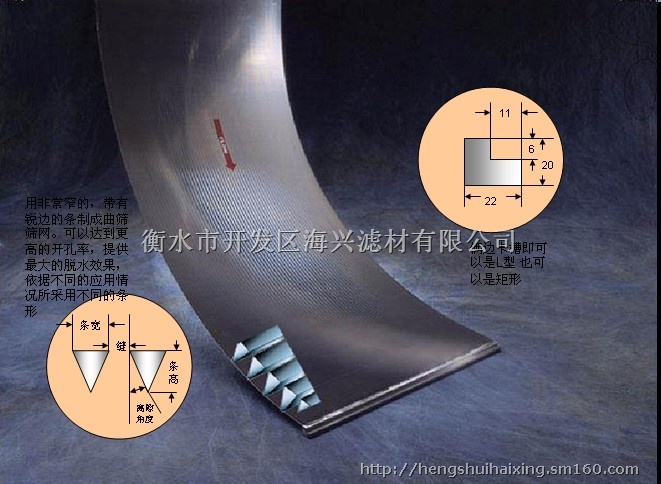 衡水海兴生产的水力筛网(压力曲筛筛片)具有不易堵塞,过滤精度高,使用寿命长的优点。大弧度的结构设计不仅增强了脱水功能,而且可以通过翻转来延长筛网的使用寿命,为客户节约了大量资金。过滤精度从0.05mm到1mm,材质为304,316L或指定材质。我公司可以根据客户需要设计不同的弧度,空隙率,过滤量,保证满足客户的使用要求。
