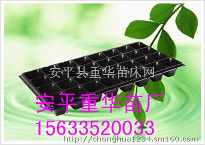 安平县重华苗床网厂专业生产的大口径塑料平底育苗盘、培苗盘、大孔径育苗穴盘,广泛应用于芽苗菜生产、花卉、树木苗的栽培、育种等,是农艺、种植用栽培盘、栽植盘的必备用品。大孔径育苗穴盘同时可适用于蔬菜、瓜果、烟草、玉米、棉花、茄子等的育苗育秧。采用PS材料,无毒环保,透气性能好,大大延长使用寿命。 我们始终以高质量、高品位、高效率作为企业的经营方针,以一流的业绩、一流的员工、一流的效率作为企业的。
