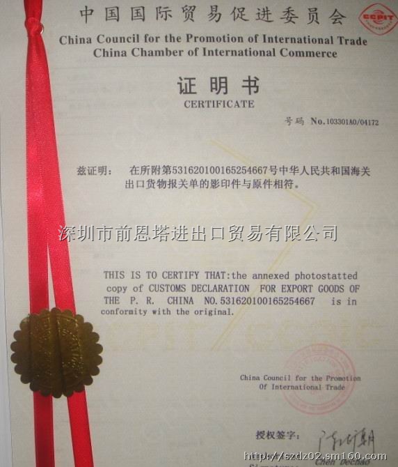 中国国际贸易促进委员会CCPIT证明书:是一种证明货物原产地或制造地的证件,主要用途是提供给进口国海关凭此确定货物的生产国别,从而核定进口货物应征收的税率,有的国家限制从某些国家或地区进口货物,也要求以产地证明书来证明货物的来源。产地证明书一般由出口地公证行或工商团体签发。在我国,它由中国国际贸易促进委员会签发。