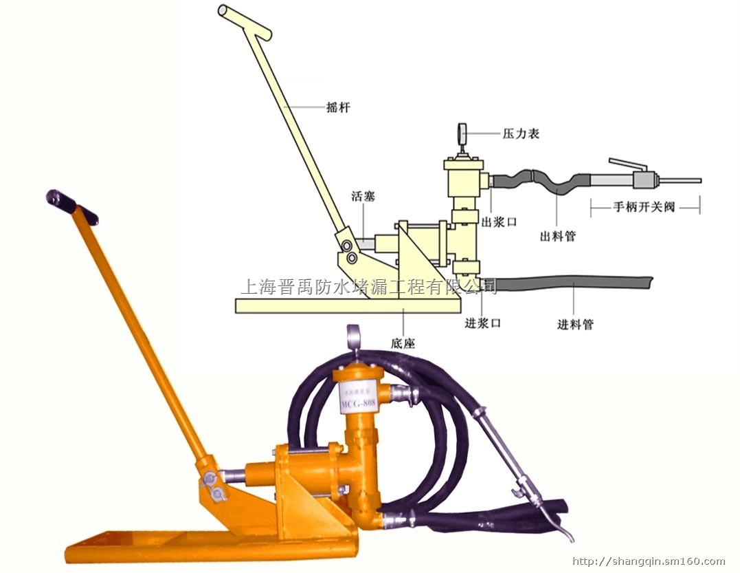 按照说明书将手动摇杆装配好。检查压力表管路内油是否充满,连接好吸料管(下部)和出料管(上部),将吸料管插入料桶,往复摇动摇杆,即可开始灌浆。