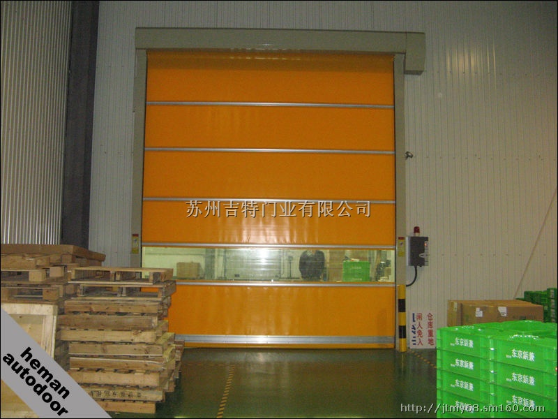 *门帘选用进口聚氯乙烯涂层织物,其内部含网状尼龙材料,外部涂有聚氯乙烯,具有高抗拉强度,高抗刺穿性能,适于频繁开起,高速运转,其速度可达0.6~1.0m/s;