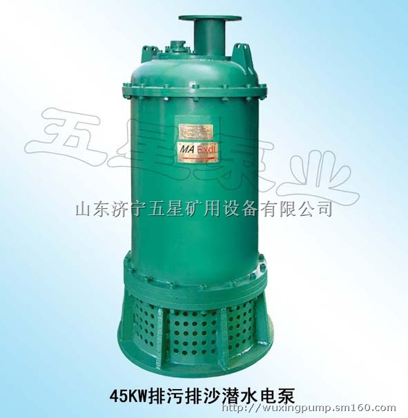BQS(W)矿用隔爆型排污排沙潜水电泵,是泵和电动机组合一体的电力排灌设备,外型美观,结构简单,密封性能好,性能稳定,寿命长,安装使用方便,且可以长期在水下连续作业,被广泛用于煤矿立井、斜井及井底散煤泥地自动化排水。内装式电泵,水由电动机夹层中流过,有效的延长了电泵的使用寿命;外装式电泵,叶轮采用双流道大过流结构,运行平稳,排污能力强,防缠绕,无堵塞现象,并且有体积小,重量轻,携带方便的特点。