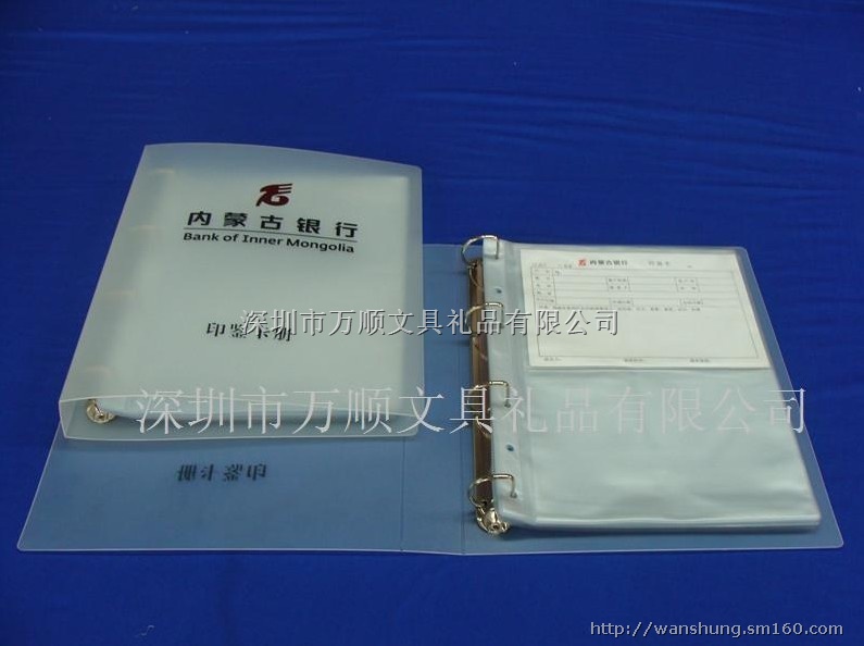 编号:印鉴册(内蒙古银行)尺寸:255*310*40(MM)材料厚度:1.2MM材质:PP文件夹采用优质环保耐用PP原材料生产,在文件夹封面烫红金,并丝印内蒙古银行名称及LOGO,钉4孔D型夹,配25张双面内页,单排二列,可装100张印鉴卡。功能:用于企业宣传,及企业文件的存档和管理