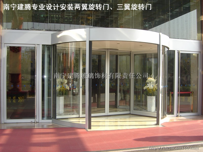 旋转门集各种门体优点于一身,其宽敞明亮和高格调的设计营造出奢华的气氛,堪称建筑物的点睛之笔。旋转门增强了抗风性,减少了空调能源消耗,是隔离气流和节能的最佳选择。旋转门最适合饭店、机场、大型商场、医院、商户会馆、酒店、办公楼、大型大厦等的出入口系统。旋转门按功能可分为手动和自动两种,按类型可分为两翼旋转门、三翼旋转门、四翼旋转门、环柱旋转门以及水晶旋转门。南宁建腾专业安装旋转门,自动旋转门,酒店旋转门。