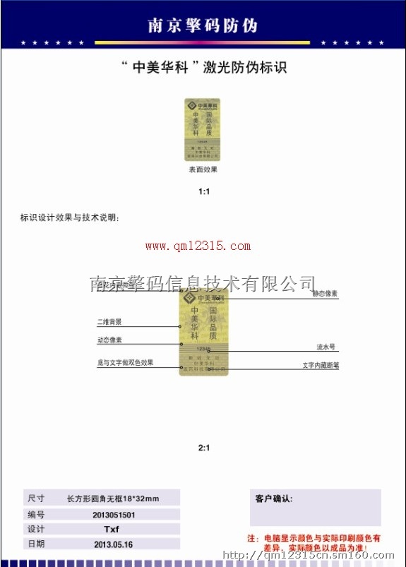 1.激光潜入技术:将激光信息潜入到物体中,在揭开前是没有显示的,揭开后在脱落层及标体上均有激光效果出现。