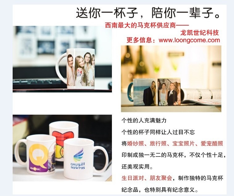 成都杯子上印照片、印图片、印文字、印风景等随心印。把自己的照片印到热转印涂层马克杯上是近年来比较流行的照片杯子技术,您只需提供自己的照片或文字,使用专用的机器和耗材就可以将您想要的效果印到涂层杯子上。成都杯子上要印照片杯子广泛应用于,送客户、送同事、送长辈、送爱人、活动留恋、毕业留恋、个性礼品、广告促销、周年纪念品等多种用途。对于创业的朋友选择成都龙凯热转印烤杯机不错,成都龙凯世纪提供各种类型的卧式烤杯机,数码烤杯机、智能烤杯机、二合一烤杯机、三合一烤杯机、四合一烤杯机等。提供的热转印马克杯款式多样,从普通白杯到各种彩杯、夜光杯、情侣杯、变色杯、保温杯、动物杯等。客户可根据自己喜好的款式多种选择。公司提供各种款式的杯子模板及相关技术免费指导。提供设备除了烤杯机,还有烫画机、多功能烫画机、烤盘机、烤帽机、水晶固化机、胸章机、公仔机、切卡机、丝印机等。烤杯机可以在杯子上印照片,烫画机是在衣服、手机壳、抱枕、鼠标垫上印照片的机器,水晶固化机可在水晶上印照片、杯子衣服上印照片的机器,杯子、衣服、盘子、帽子都可以印的四合一多功能烫画机、往杯子上印照片的烤杯机、成都热转印工艺礼品定制,成都diy个性礼品加工,成都广告T恤会员T恤个性定制,成都广告杯礼品杯马克杯变色杯夜光杯情侣杯个性定制,礼品杯定做,礼品杯批发,礼品杯价格,礼品杯报价,礼品杯图片 ,礼品杯参数,礼品杯厂家,礼品杯质量,礼品杯专卖,供应礼品杯,礼品杯订购,礼品杯介绍,礼品杯网站,,礼品杯工厂,礼品杯订做,礼品杯供应商,定做礼品杯,批发礼品杯,礼品杯制作,礼品杯生产,礼品杯定制,礼品杯印LOGO,杯子印LOGO照片,用自己照片印杯子、将自己的相片印到杯子上、如何将自己的照片印到杯子上、广告杯礼品杯定制、倒开水显示照片的变色杯、个性照片马克杯定制、将明星照片印到杯子上、智能烤杯机简单印照片杯子、衣服上印照片图案的烫画机、抱枕上面diy自己的图案、手机壳上印图案、瓷砖上印画、鼠标垫上印自己的照片、自己的个性化妆镜制作、diy热转印打火机、石头上面印画、拼图上印图、珠光板上印图案、水晶上印照片、diy水晶影像照片、恋人结婚照印到水晶上、水晶影像小本投资、千元水晶影像创业、水晶影像耗材批发、水晶影像定做、免打磨水晶影像、水晶影像制作技术、水晶影像制作方法、个性胸章制作、人脸个性公仔娃娃、公仔毛绒玩具、商务手印泥制作、宝宝手脚印、手足印、商城开业暖场活动、楼盘暖场手摸、杯子上印照片、印自己的照片、在杯子上印画的设备, 杯子上印字,衣服上印、杯子上印画,杯子上印照片或衣服上印照片的的机器, 把相片印在杯子上, 印在杯子上的照片 把杯子印上顾客的相片出售, 在杯子上印图的机器, 烤图片到杯子的店, 个性杯子烤图,礼品首选, 杯子烤图, 杯子上印画、在衣服上印画,,在瓷砖上印画,长年订做杯子印字、陶瓷杯印字、礼品DIY手艺吧,杯子上印字、马克杯印字,杯子印图、照片杯子做礼品,衣服T恤上印自己的照片,个性T恤diy定制,广告发工作服制作,个性情侣T恤定制,广告马克杯定制,热转印变色杯定制,水晶影像照片定制,个性照片旋转方体,专业制作各种diy马克杯、LOGO广告杯定制、磨砂变色杯定制、夜光杯、汽车杯、个性情侣杯、保温杯、内彩杯、全彩杯、会议杯、强化瓷杯、骨瓷杯等礼品杯,热转印鼠标垫,个性抱枕,diyT恤,情侣T恤图案,亲子T恤照片,diy手机壳,个性苹果手机壳定制,三星手机壳,水晶印像,相框,石头上印照片,工艺瓷砖上印图,拼图,化妆镜,个性打火机定制,木版画制作,婚纱照木版画,商务手印泥,宝宝手印泥促销礼品,奥运礼品、礼品设计、礼品公司、礼品网、四川礼品公司、成都个性礼品制作、商务礼品、中秋礼品、促销礼品、奥运礼品等投资小、利润高。让加盟此项目的您轻轻松松创业成功。同时公司也为各企事业单位如房地产、酒店、商场、公司、饭店、政府部门及个人等提供各种个性工艺礼品定制。网址:http://www.loongcome.com咨询电话:15882067218 QQ:1459255392 联系人:孙冬梅
