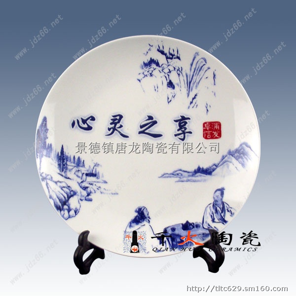 陶瓷看盘的图案可用青花山水,山水纹饰,人物纹饰,花草纹饰, 欢迎订购您的图案加在陶瓷看盘上。