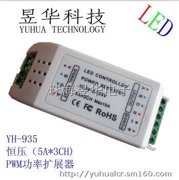YH-935恒压功率扩展器,它适用于我公司所有单色和RGB控制器的功率扩展。功率扩展器可接受PWM(脉宽调制)控制,每增加一个功率扩展器就可以多连接一陪至三倍的LED灯数量,理论上可以连接无限多个功率扩展器。恒压跟恒流的扩展器可以混合连接,方便不同电压、大功率和小功率的LED灯具统一控制。非常适合各种商照、酒店房间等工程。