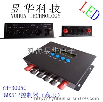 YH-300AC 控制器是一款LCD 液晶数码界面显示,用于控制四线三回路(共阳极)LED 灯具的RGB 颜色变化,多达36 种变化模式选择,同时可接受DMX512