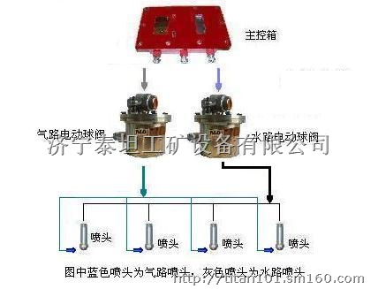 当传感器探测到控制信号时,信号送入主控箱,主控箱先后控制高压风阀、高压水阀开启,将高压风、高压水输送到风水喷头(即气水喷头)进行喷雾降尘(风水喷头可对风水压力大小进行调整),喷雾工作至延时时间(延时可调)停止喷雾降尘;当信号再次触发时,进行下一个工作循环过程。