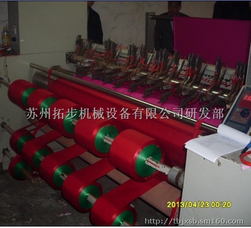 热切机用途与特点:苏州拓步机械设备有限公司生产的热分切机(热切捆条机、热切机、斜纹热切机、电热分条机、热分切机、热分条机、电热分切机)操作简单,是多刀型排刀分切,分切宽度可根据需要在最小分切宽度的基础上任意调节。生产速度任意调节,机械操作平稳灵活。热分切机主要采用电子恒温控制系统控制切刀加热,没有任何热导中介,极大的减少了能量损失,从而提高节能效果,切边光滑整洁,不留布焦。自动进料与收料一次性完成,边料自动收卷。热分切机采用独立的光电自动对边系统,使分切过程平滑顺畅,布料更整齐,大幅减少边料的损耗。     热分切机所用的热切刀采用钨钢合金经过特殊工艺加工制成,使用寿命得到大幅度提高。在分切的同时,利用温度将布料的毛边封住。使布料没有毛边产生。并不留布焦。