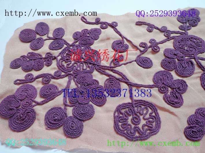 供应绳子绣花虎门机器绣绳子推荐诚兴三合一绣花厂,本公司作为绳子绣厂家一切产品都是机器绣绳子价格绝对优惠。诚兴三合一绣花厂直接在自家工厂生产绳子绣花保证了机器绣绳子的质量和价格,同时诚兴三合一绣花厂还专业加工各种服装、鞋帽电脑绣花,特种绣花,包括有绳子绣花,机器绣珠子,机器绣珠管,电脑车绳子,电脑珠片绣,电脑绣铁链、珠链,机器绣绳子,电脑毛巾绣,绳股绣,丝带绣(盘带),机器绣毛线,立体绣,植绒绣,布匹绣,各种特种立体绣,巧手订珠和款式各异的特种混合绣,诚兴三合一绣花厂欢迎新老客户来电咨询或参观