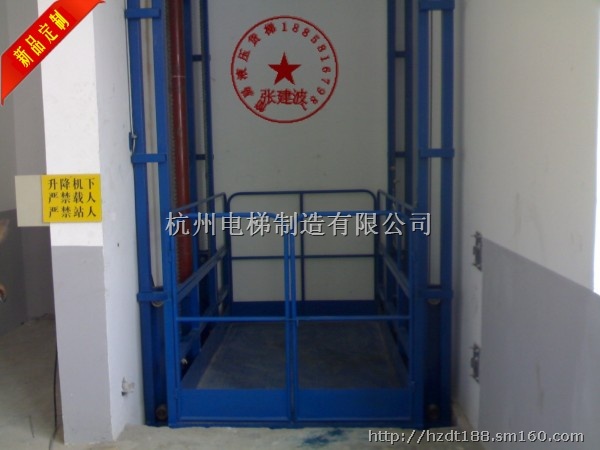 1)额定载重量大:按用户要求定做,最大载重可做20吨,大吨位设计台面两侧采用两支直径90mm液压油缸,小吨位设计采用单只或台面两侧采用两支直径60mm液压油缸,利用每层楼板井道面固定,现场电焊固定制作,利用导轨加链条式上下滑行,采用钢丝绳做垂直保护,安全平稳。