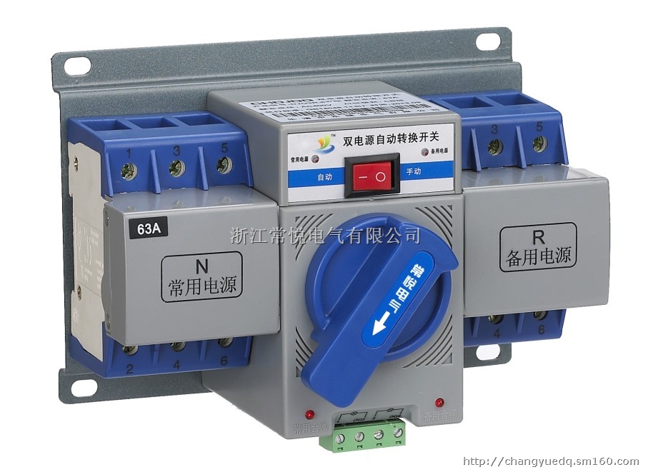 CYQ3R-63迷你型双电源自动切换开关(切换装置)适用于交流50HZ,额定工作电压380V及以下的双电源供电系统,用自动或手动操作方式来完成常用电源与备用电源之间的切换。该切换开关主要用于医院、商店、银行、冶金、高层建筑、军事设施等不允许断电的重要场合。