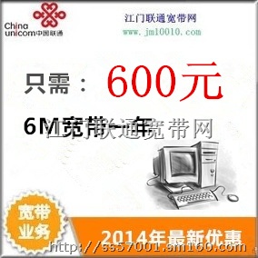 江门联通宽带第一季度6M“最”优惠,6M宽带包一年只需600元,两年只需960元,三年只需1260元。