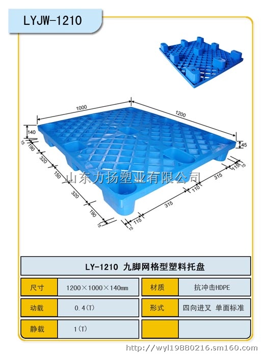 厂家直销承德市塑料托盘厂家王总0539-8399933、13853980306山东力扬塑业有限公司,是一家世界排名前十的塑料托盘专业生产厂家,公司成立数十年来,规模达到10几个亿。1250川字网格:1250*1000*155mm 动载:1.5T 静载:6T 货载:0.6T(加钢管)