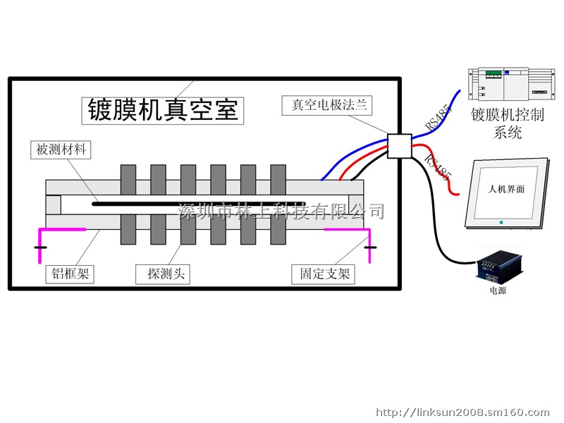 真空镀膜在线检测装置,适用于各类镀膜生产线上,通过选择监控产品的可见光透过率,红外线透过率和光密度值(OD),来达到在线检测和分析产品镀层厚度,镀层厚度的均匀性等性能是否在工艺要求之内。以便操作人员及时了解产品质量,如有问题,及早发现及调整工艺,提高产品品质,降低产品的废品率。