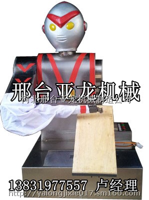 既不受人力限制,而且可以长距离的挥臂可以把削面动作做的足够长,长达55厘米,经过测试,工作效率是人工的3倍以上;连续工作10个小时耗电 量不到为3度,按现在电价计算一天不会超过3元电费,而人工工资每天最少百元以上,由于穿着厨师服装模拟了真人削面,因此更能吸引顾客的注意,特别受到关注。削出的面条既可以刀刀均匀,也可以更换程序模拟人工削的面,一刀厚一刀薄粗细有变化,有棱有角,色泽好、外形似柳叶,中间厚两边薄,口感爽滑 有咬劲,有韧性,口感大大优于市面上销售的削面机。