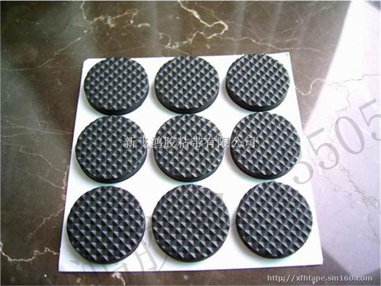 橡胶脚垫是以EVA(中文名:聚乙—乙酸乙脂)泡棉为基材,在其一面或两面涂以溶剂(或热溶型) 高持粘的压克力胶, 再复以易剥离的白色离型纸制造而成,有黑白两种颜色。厚度通常有1mm、1.5mm、2mm、2.5mm、3mm等。