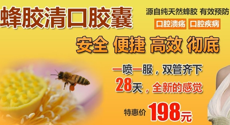 三、靶向集中“蜂胶清口胶囊,.这是第一个针对口腔溃疡而研制的天然蜂胶保健品,其药理吸收过程通过各医学科的试验,对人体无任何毒副作用,具有吸收快,稳定性强的特点,达到标本兼治的目的。