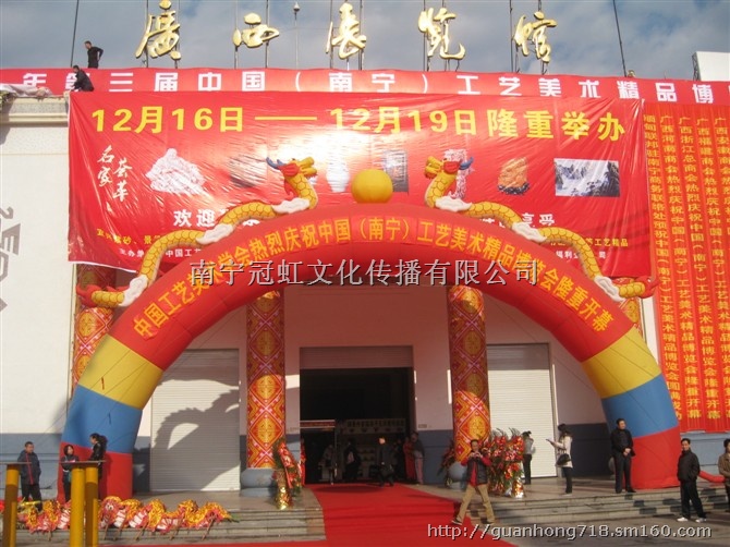 南宁充气拱门多少钱一个?充气拱门出租多少钱,找一家租赁充气拱门比较便宜的公司,多种造型的充气拱门,双龙拱门、彩虹门、婚庆拱门、庆典拱门等等。0771-3926546 充气拱门产品怎样正确升起: 一、首先固定好电源线,做到开、关店门都无妨碍; 二、打开拱门包,展开拱门,在拱门前面的2个绳扣上分别系好绳子,后面的两个绳扣也系好绳子; 三、在拱门两个着地脚里面分别塞上沙袋; 四、吹起气模,调整好位置;如果不稳定,请用前后绳扣上的绳子将拱门固定好; 五、使用拱门的前一天注意天气预报,如果有风,就需要准备固定绳索,沙袋多放一个即可。如果有六级以上的风,则不宜吹起拱门; 六、使用中,如果是行人不小心碰掉电源使拱门倒下,只需重新插好电源,拱门即可重新站立起来了。