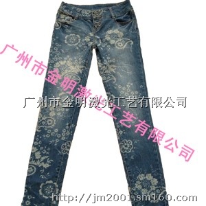 金明激光研发的牛仔布激光印花技术,采用欧洲最先进的激光设备,能长时间流水线工作,加工速度快,完全替代了以往复杂的牛仔布加工工序,如药水浸泡、水泡、砂洗、石洗等繁琐的过程,解决了传统工序耗工耗时耗材的缺点,不久的将来会全部替代掉原有的传统牛仔服装后整理工序,建议牛仔服装行业尽快投入使用!!