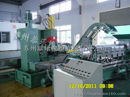 炭黑色母粒造粒机物料密炼后能强制进入单螺杆,螺杆全称分散,无过分摩擦热。分散效果优异,主机电流小,炭黑色母粒造粒机节能环保。此机台用于PVC,低烟无卤电缆料,内外屏蔽电缆料,氯化聚乙烯,功能母粒,炭黑色母粒造粒机色母粒,热收缩料,PP+炭黑低烟无卤系列及各种橡胶母粒的生产,包括主机,双腕强制入料,模面热切等系统将密炼机撹好的原料经双腕挤入造粒机内,炭黑色母粒造粒机后经单螺杆挤出后切成粒子,此机组操作非常简单。炭黑色母粒造粒机密炼机----提升机------锥双喂料机---------双螺杆-------- 水环造粒机-----离心脱水机---------加长风冷振动筛------成品料仓