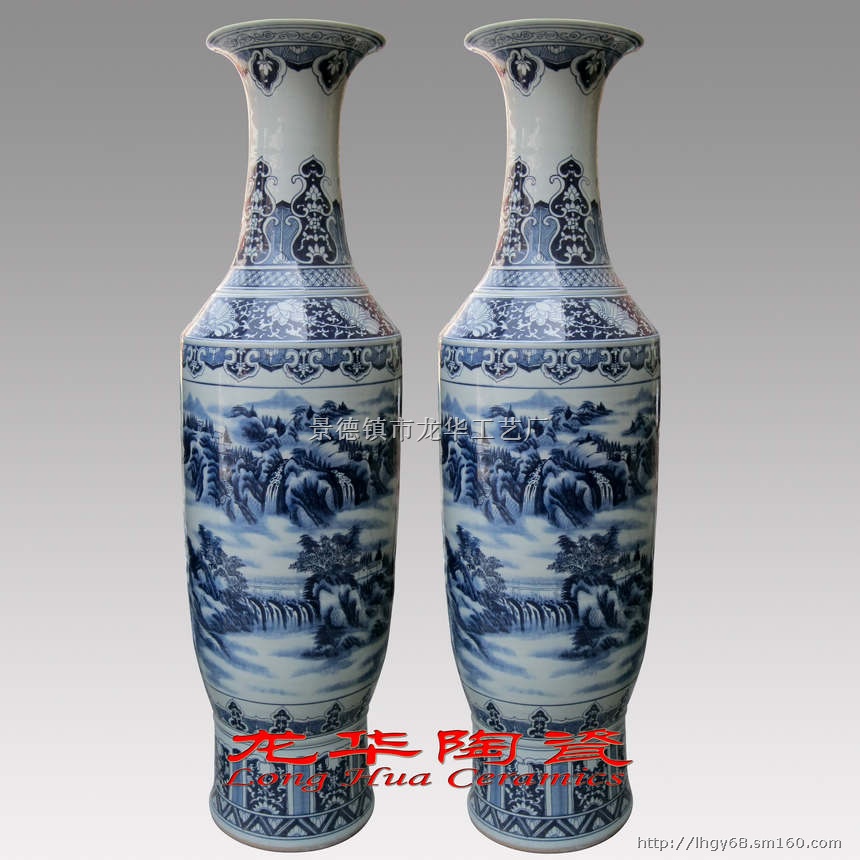 在乔迁庆典、客户商务活动、大厦落成、新厂搬迁等大型活动中很多客户选用这种大花瓶作为商务礼品,乔迁之喜礼品赠送,以表达他们的贺意。景德镇瓷器素来以全手工生产著称闻名。而随着现代机器化的普及,纯手工生产的瓷器也越来越珍贵。而我们这种陶瓷大花瓶却是完完全全的全手工生产。从手工拉坯到手工绘制每道工序都是人手工完成的。因为景德镇瓷器中越大高度,越大肚径的瓷器生产工艺就越难,越不容易成型。这种大花瓶的制作工艺复杂,烧制困难。所以一件好的大花瓶瓷器收藏价值也高。景德镇瓷器耐千度窑火烧制而成,所以是可以永久保存的。就是放在屋外风吹雨晒质量也毫不受损。放在园林装饰,庭院装饰都是完全没有不损花瓶质量的。客户可以放心选购。