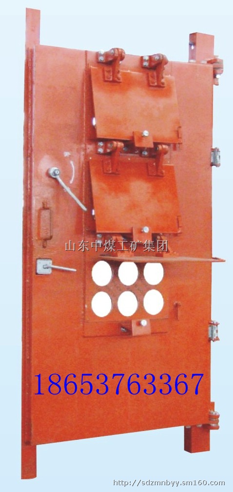 2、门扇上部装有三组通风活门装置,即在活门底板开有三组共18个直径122mm的通风孔,活门板外部装有自动张开12度角的活门悬板。每组活门通风量为2000立方/h,总通风量为6000立方/h,风速按8m/s进行设计,使用时可根据井下爆破材料库需要风量和总回风道负压值,确定通风活门组数,并可调节每组活门悬板的张启角度进行微调,以满足最佳通风量。当库内一旦发生意外情况,冲击波经过衰减后,余压只要大于20KPa时,活门悬板受压再3-8s内自动关闭,与外界隔离,起到保护作用,由总回风道排出。