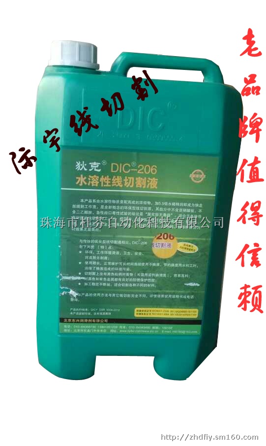 品牌: 狄克牌型号: DIC-206 宝贝详情DIC-206 是节能、减排型线切割液。完全由水溶性物质构成,其电蚀产物通过沉淀和过滤方式可祛除;小鼠毒理试验结论是“属实际无毒级”;切割工件表面不产生油泥,是“中走丝”多次切割机床的最佳工作液,具有突出的卫生、安全等优异特点。RoHS指令检测,六大项 24 子项均为未检出。