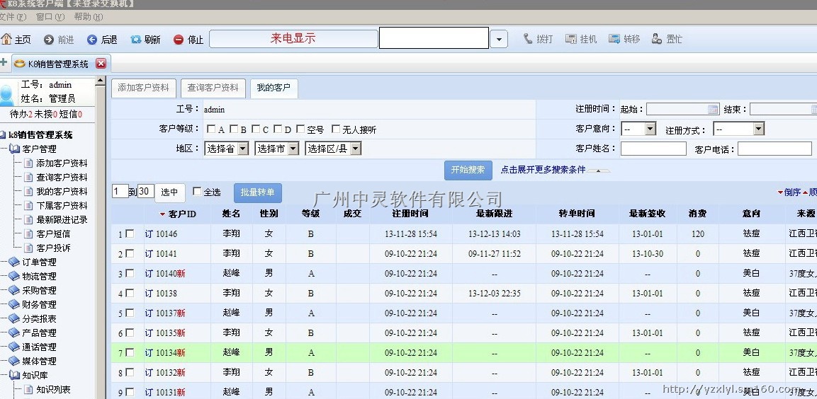 K8电销系统,目前市场上根据电话销售电视购物等行业量身定做的集呼叫中心(Call Center)、客户关系管理(CRM)、订单管理、物流配送、进销存管理,财务管理于一体最专业的的销售管理系统,能够高效管理客户资源、提高进线客户下单率、流程化管理订单从下单、审核、发货、收退货以及快递公司结算,结合仓库的进销存管理,有效的将公司销售部门及各后勤部门统一在同一平台上高效的开展协同工作。