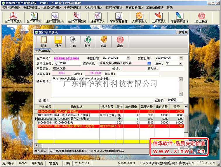 ·生产流程规范化:《信华ERP生产管理软件》满足企业从接单、下生产单、生产审批、物料消耗采购、材料领用、生产过程跟踪、生产完成入库、送货以及所产生的应收应付业务和所有管理报表,进行全过程的规范化管理。