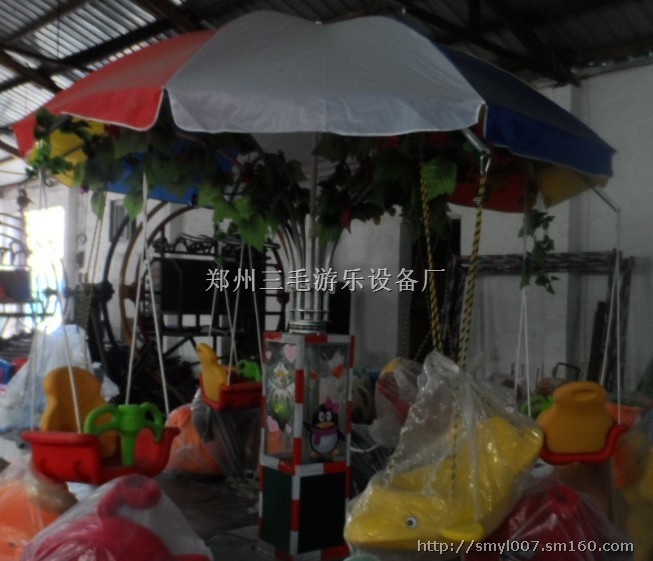 配有各种音乐。座位鱼和上面的12根支架可很方便的拆卸,拆卸后一辆电瓶三轮车就可运输。而且一个人就可以轻松装卸,比起旋转木马安装起来不知轻松了多少倍,占地面积小,运输方便,赚的钱和大型旋转木马差不多。不过投资少多了。