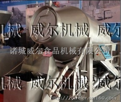 真空制冷滚揉机选用优质SUS304不锈钢材质,采用摆动支架,卧式倾斜滚揉,自动翻转倾斜出料的工作原理。该机具有更大的装载能力,能完成肉块中能量转化的一个物理过程,提高盐溶性蛋白的提取,使腌制液在肉内均匀分布并被充分吸收;增强肉的结合力,提高产品弹性,能更快改善产品的切片性,防止切片时产生破碎;增加保水性,提高出品率,增加产品的柔嫩性和结构稳定性。滚揉筒内表面精细抛光,减少额外温升,无卫生死角,利于清洗。主要适用于西式香肠、火腿、培根、烤肉以及传统中式禽类、酱卤类、休闲类肉制品的腌制加工,是大型食品加工企业理想的选择。