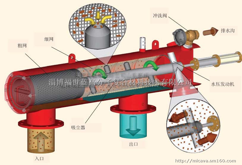 水由进水口进入过滤器,首先经过粗滤芯组件滤掉较大颗粒的杂质,然后到达细滤网,通过细滤网滤除细小颗粒的杂质后,清水由出水口排出。在过滤过程中,细滤网的内层杂质逐渐堆积,它的内外两侧就形成了一个压差。当这个压差达到预设值时,将开始自动清洗过程:排污阀打开,主管组件的水力马达室和水力缸释放压力并将水排出;水力马达室及吸污管内的压力大幅下降,由于负压作用,通过吸嘴吸取细滤网内壁的污物,由水力马达流入水力马达室,由排污阀排出,形成一个吸污过程。当水流经水力马达时,带动吸污管进行旋转,由水力缸活塞带动吸污管作轴向运动,吸污器组件通过轴向运动与旋转运动的结合将整个滤网内表面完全清洗干净。整个清洗过程将持续数十秒。排污阀在清洗结束时关闭,增加的水压会使水力缸活塞回到其初始位置,过滤器开始准备下一个冲洗周期。在清洗过程中,过滤机正常的过滤工作不间断。