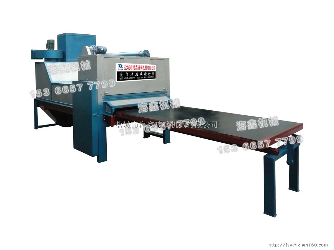 HXP海鑫集团玻璃机械公司研制生产的环保型全自动玻璃喷砂机,高效的流水线生产方式,只要将玻璃平放在小车上,玻璃经过密闭的自动喷砂区间,就能完成整个喷砂过程,一次完成。免去了大功率空气压缩机的使用。喷砂机打砂的原理就是利用安装在滚桶上高速旋转的钢刀所产生的离心力,使金刚砂高速向加工玻璃表表面击打的方式设计,完全颠覆了传统手工喷砂的方式。价格仅为国外同类产品的1/10,使用效果却达到了国内外同类产品的水平,简单说喷砂机,就是用离心力和砂混合把要打掉的东西打掉。本产品可以用于大理石、不锈钢和玻璃雕刻。基本程序是这样的: