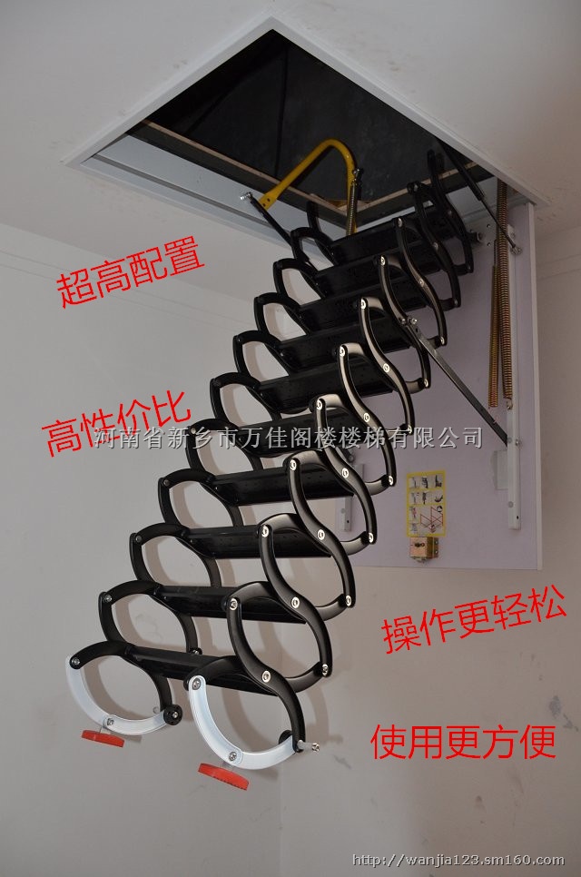 祝您购物愉快.手动款只能楼下操作,想楼上楼下都可操作的用户请你选择电动遥控款。伸缩楼梯枝术说明 1、楼梯采用高强度冷轧碳钢。 2、钢质边框、静电喷塑、高温烘漆表面处理 3、金属件经菱化、静电喷塑、高温烘漆表面处理,历久弥新。 4、美观实用、操作方便、安装简单。是替代固定楼梯、节约室内空间的最好选择。半自动款详细说明:S弯是圆角形状表面光滑细腻,S弯是采用2.0mm厚高强度国标优质钢板冲压而成。踏步表面为平面花纹状,采用1.5mm厚国标优质钢板冲压而成,踏步长400mm宽100mm每台阶高250mm以内,边框和踏步均为钢质,表面净电喷塑。门板内心采用橡木木板宽120mm厚度25mm制作目字形框架,内空填充蜂窝泡沫,上下粘压力5mm厚白色免漆板,门板总厚度35mm,可以选择PVC包边。在楼下看不到门板上的镙丝,配置是用加大连体三角专用铰链代替了传统的合页,配置有自动关门装置,两根油压杆,两根弹簧,使用更轻巧更稳定更安全更美观。最大安全载重量230公斤。 1、本产品只走物流(需客户物流点自提)。 2、(不包邮地区,香港,,台湾,奥门),国外的客户进仓费自付。国内偏僻地区、县城,请咨询客服物流是否能到达, 3、当您收到产品时应立刻开箱检查,若有明显损坏,千万不要签收,请和我们联系处理。 4、提货时请带上身份证,只有收货人可以提货。 5、可以货到付款,需交付200元订金,有支付宝的客户最好用支付宝