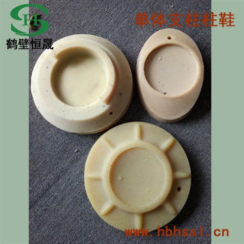 尼龙柱鞋 高抗压柱鞋 单体支柱柱鞋:鹤壁恒晟塑料制品有限公司(可根据客户需要生产不同规格的单体支柱柱鞋、柱帽、矿用电缆挂钩、地辊、背板、垫板、衬托、衬套、衬轮、衬板、尼龙棒、滑块、树木支撑架)安标证号:EE201488本实用新型涉及矿井支护类产品,用于软底回采工作面,尤其是特软底板条件的单体支柱柱鞋。(单体支柱柱鞋,尼龙柱鞋,塑料柱靴)底面设计为向上拱起的弧形面,只设一只回收耳,加强筋增为八条。结构合理,受力状态好;稳定性好,不滑移、不侧斜,能有效地减少支柱钻底量,相同条件下约为平底柱鞋钻底量的二分之一至三分之一,能保证支柱的初撑力和迎山力,提高支护,并有重量轻,强度高,节省材料等特点。