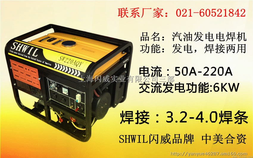 本款机器可常态焊接焊条2.5、3.2、4.0焊条换人不换机。220A发电电焊机发出额定功率输出:(50ZH)5KW,后备功率输出:(50HZ)6KW。本机可随自身情况自调电流,调节电流范围50A-220A。本款机器为电启动移动式发电电焊一体机。[销售人员]:晏越[电话热线]:15221940380 021-60521842 QQ: 2869749482